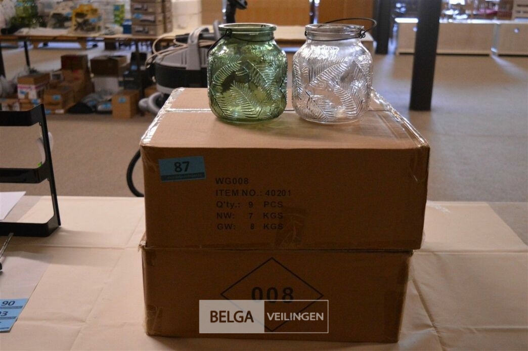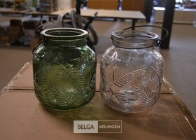 ± 18 glazen potjes met relief diverse kleuren ± H=17 cm Ø10 cm