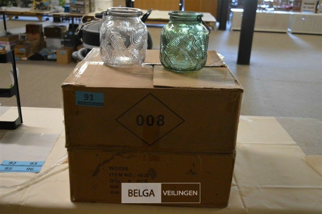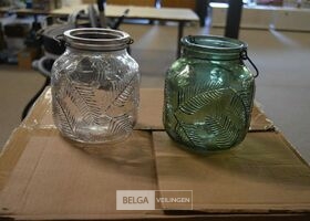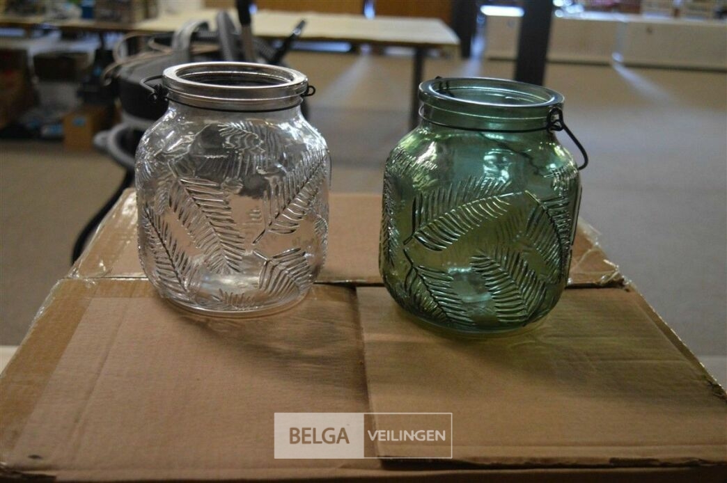 ± 18 glazen potjes met relief diverse kleuren ± H=17 cm Ø10 cm