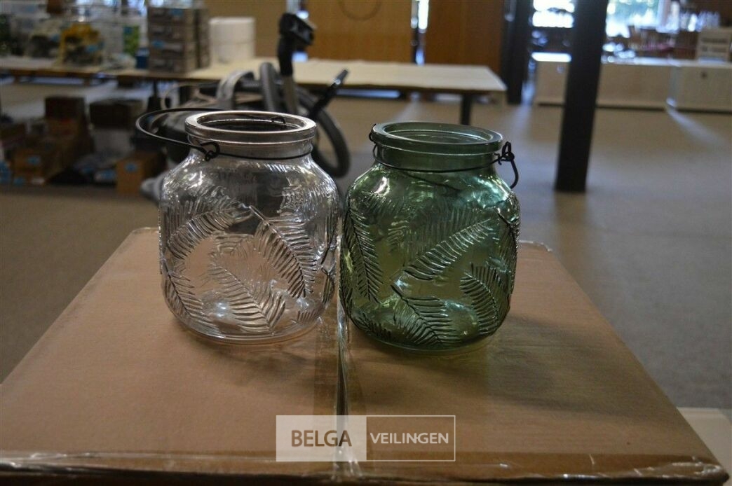 ± 18 glazen potjes met relief diverse kleuren ± H=17 cm Ø10 cm